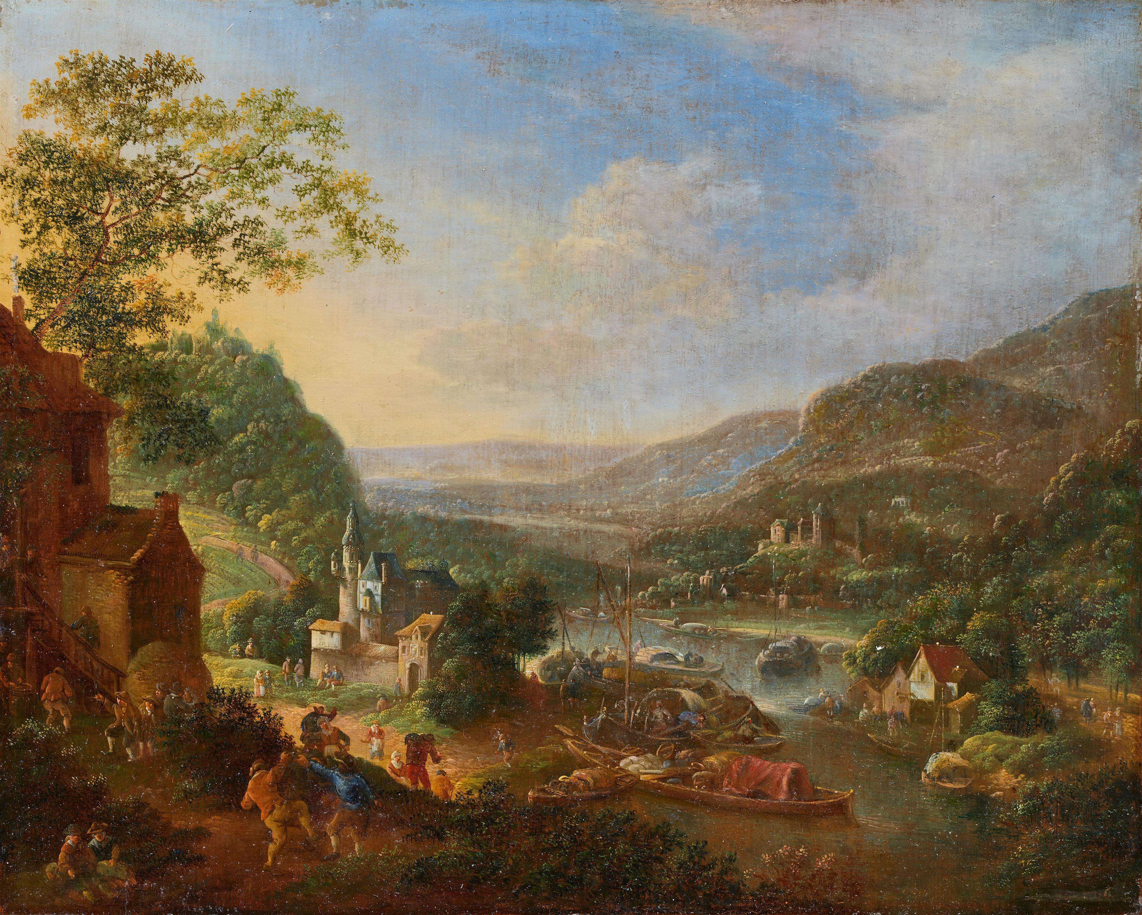 - Idealisierte Ansicht des Rheintals mit tanzenden Landleuten