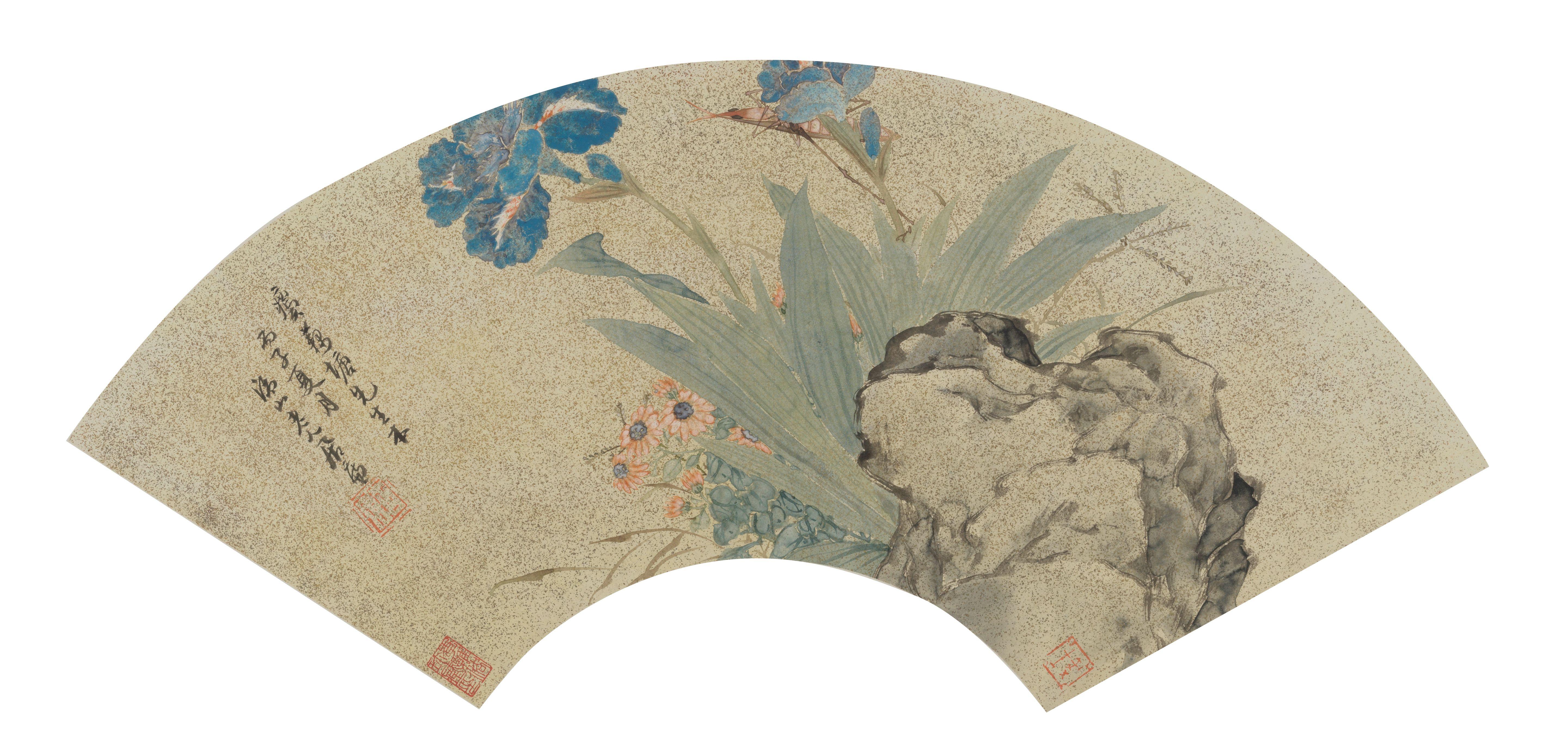 Folding fan, mounted, framed and glazed, ink and color on gold-flecked paper, inscribed by the artist with a dedication, dated bingzi and signed Geshan Laoren Ju Lian with two artist's seals and a collector's seal of Li Guorong (1929-).