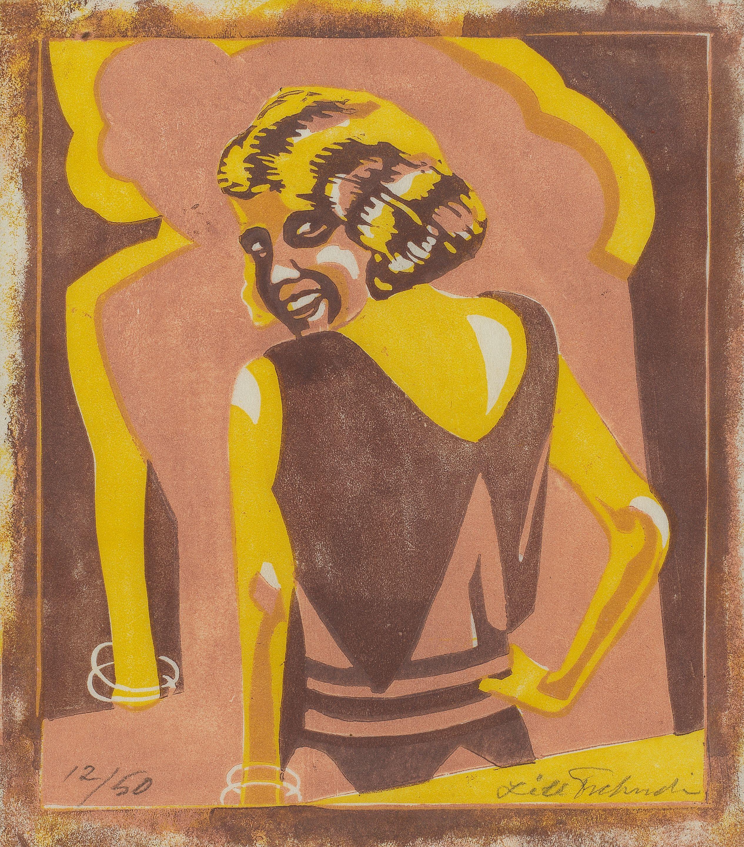 Linocut printed in light burnt sienna, mauve and yellow, 1930, on thin oriental laid paper, signed, annotated 'Meine Schwester' and numbered 12/50 in pencil, framed