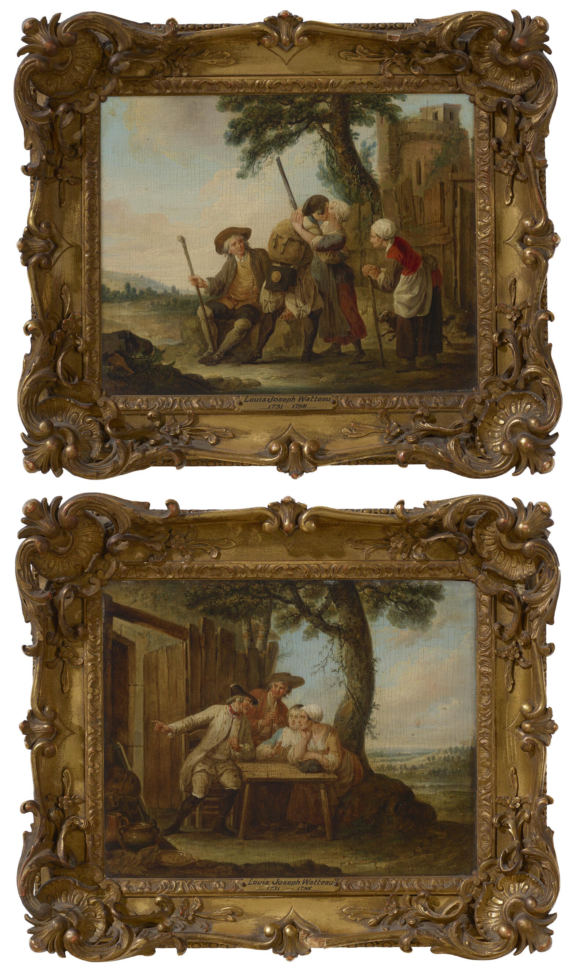 LOUIS-JOSEPH WATTEAU, CALLED WATTEAU DE LILLE (VALENCIENNES 1731-1798 LILLE) The Soldier's Farewell; and The Return the first: signed with initials and dated 'L.W. 1771' (lower left); the second: signed with initials and dated 'L.W. 1771' (lower center) oil on panel 9 x 11 1 ⁄ 4 in. (22.9 x 28.5 cm.), each a pair