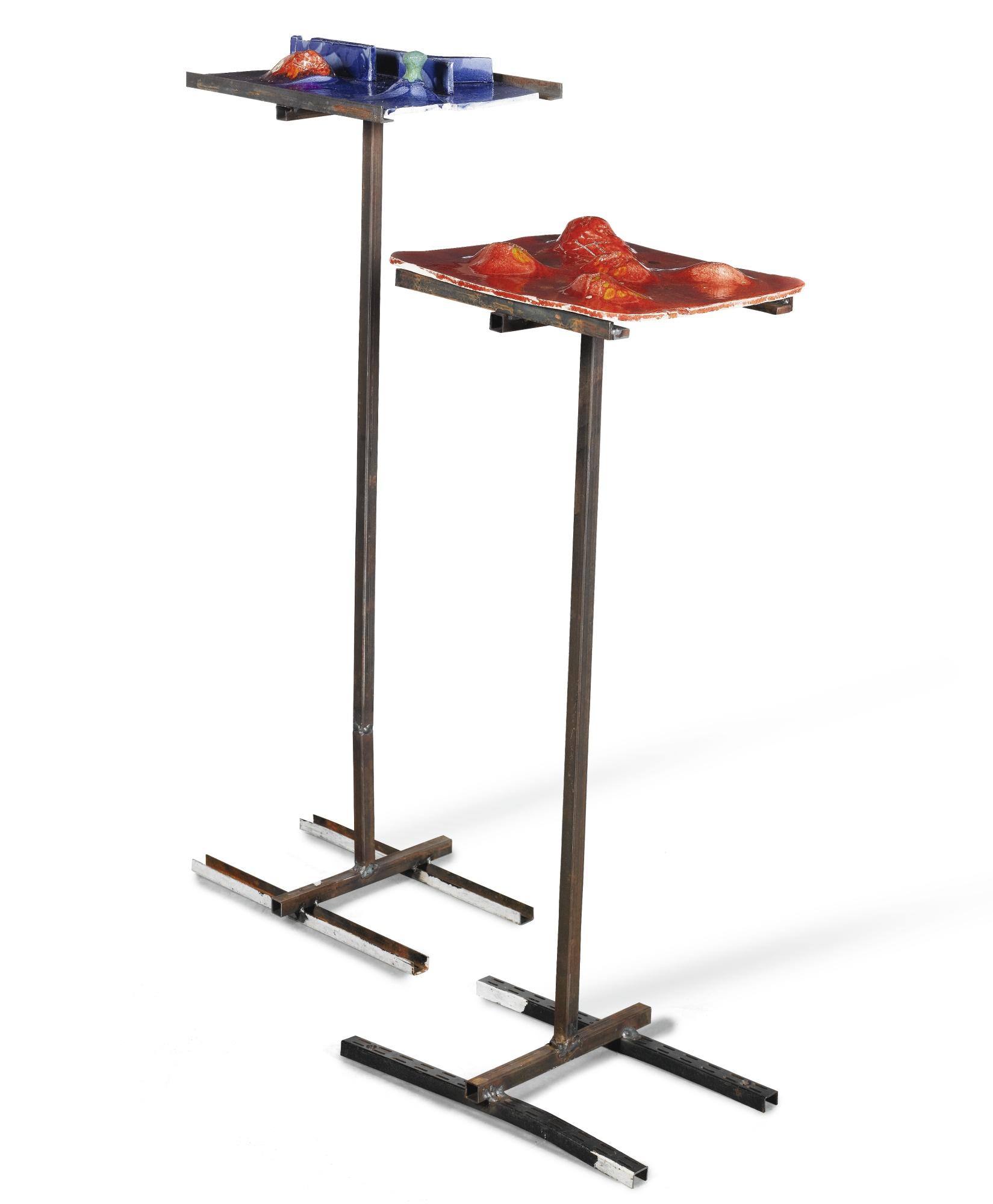 signed on a label affixed to the reverse of the blue ceramic; embossed with the date 06 on the red ceramic