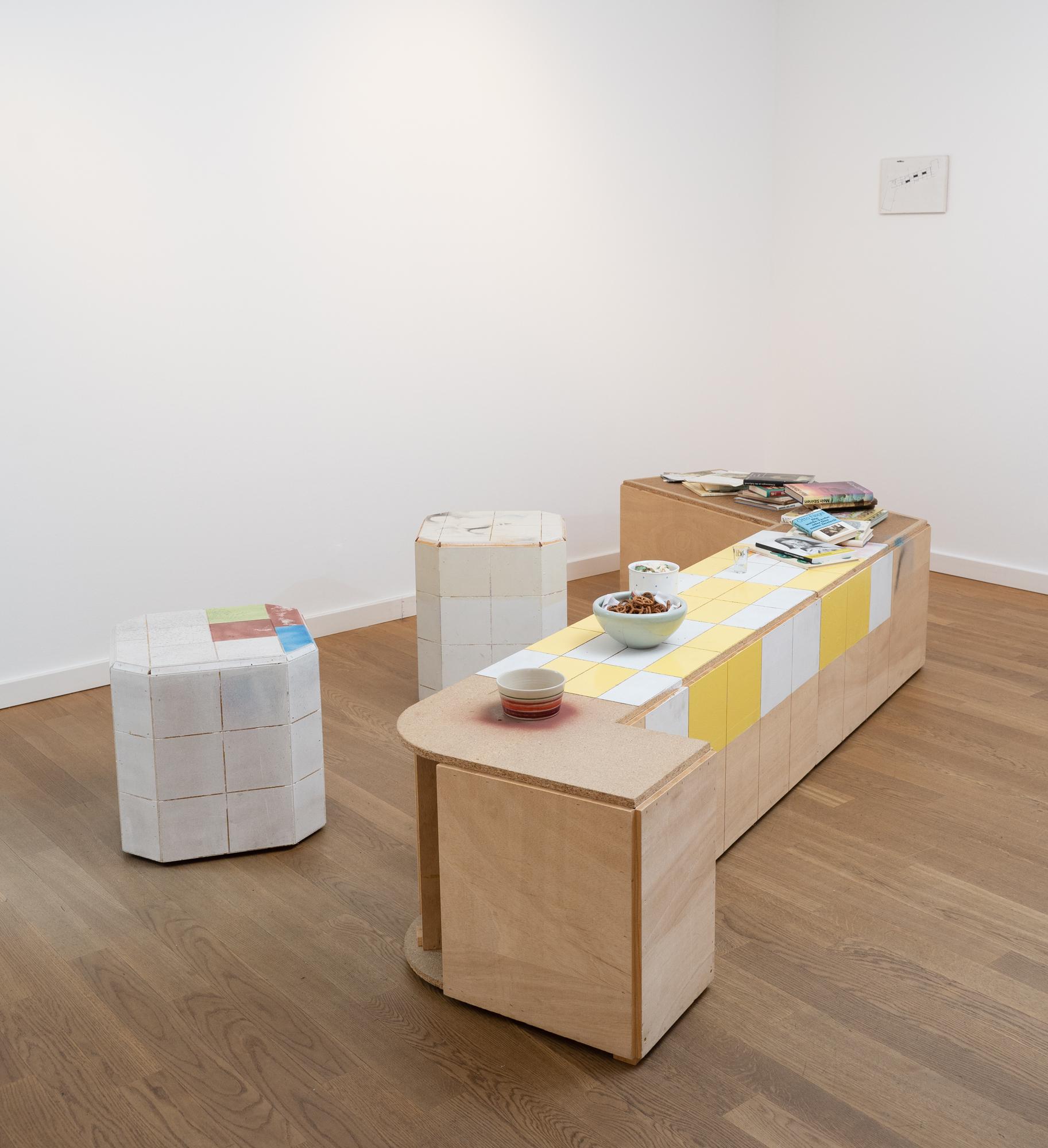 Mehrteilige Installation mit Holz, Keramik und Büchern. (2008). Ca. 50 x 168 x 127 cm, ca. 54 x 45 x 45 cm und ca. 48 x 48 x 48 cm (Installationsmaße ca. 54 x 300 x 168 cm).
