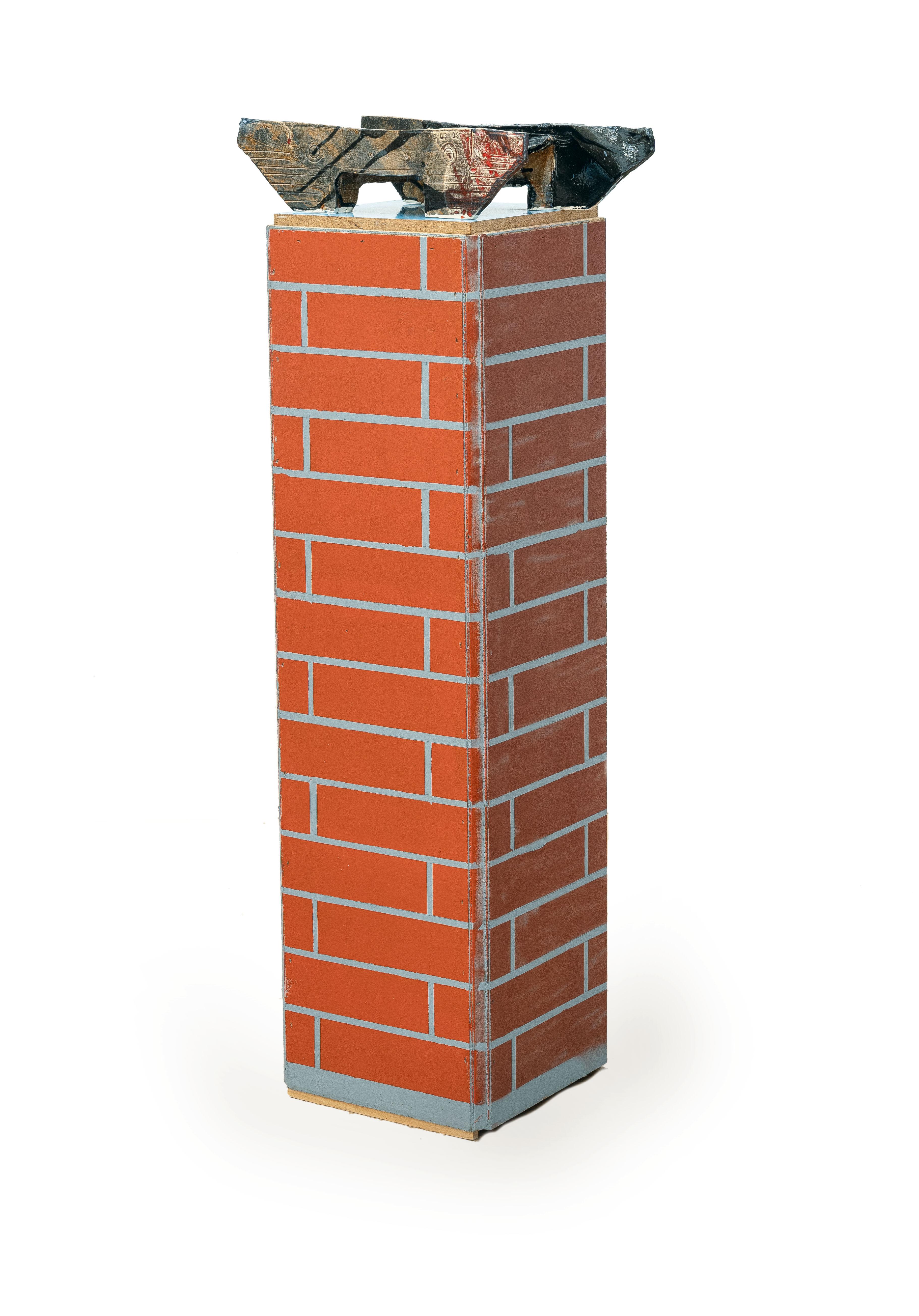 Keramik mit farbiger Glasur und Holz, farbig gefasst (2-teilig). 2009. Ca. 118 x 33 x 33 cm (Sockel) und ca. 12 x 53 x 21 cm (Objekt). Mit gestempeltem Monogramm und Datierung auf der Rückseite sowie vorderseitig erneut zweifach datiert „1.03.09“.