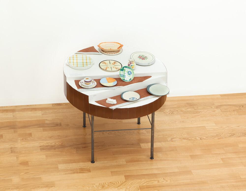 Pressspanplatten, weiße und braune Lackfarbe und Metall, bestückt mit Weimarer Keramik (4 Teller, 1 Gedeck, 3 Tortenplatten, 1 Vase und 1 Schale) und 2 Deckchen. (2010). Ca. 101 x 123,5 x 123,5 cm.