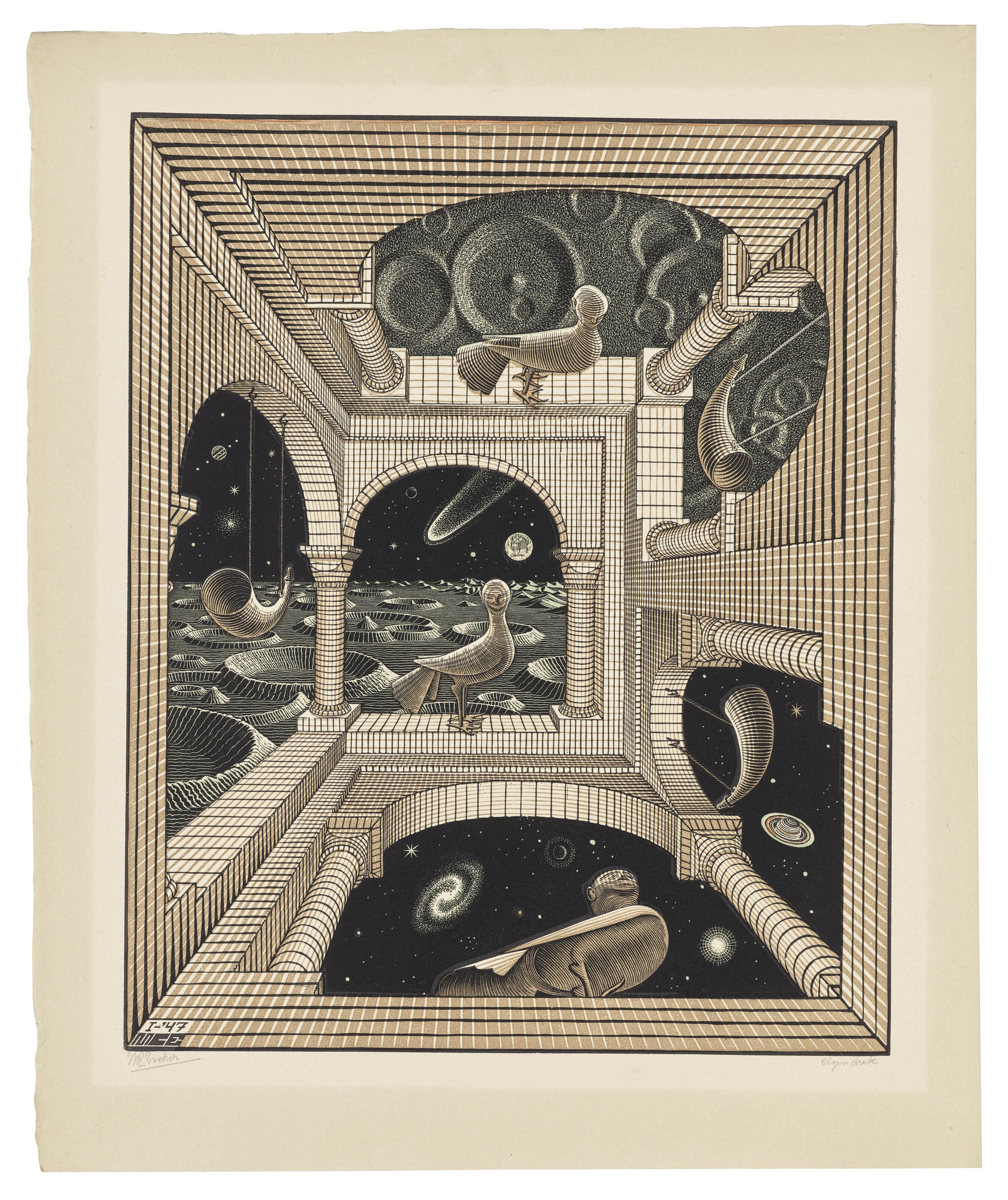 MAURITS CORNELIS ESCHER (1898-1972) Other World woodcut and wood engraving in colours, with touches of hand-colouring in orange ink, 1947, on wove paper, a fine impression printing with great clarity, signed in pencil, inscribed ' eigendruk ', printed by the artist Block 318 x 260 mm. Sheet 387 x 318 mm.