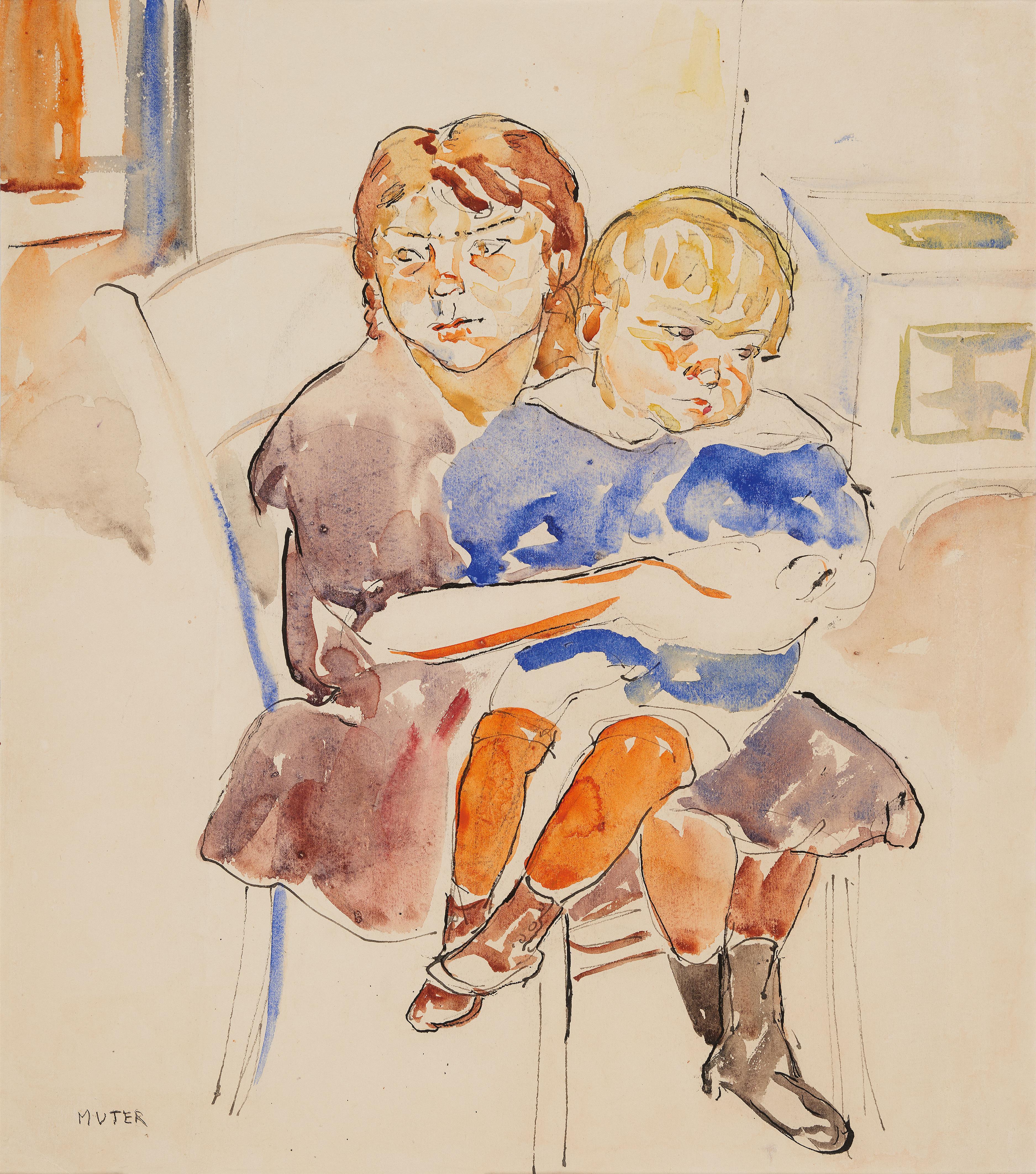 Aquarell und Rohrfederzeichnung auf elfenbeinfarbenem festen Büttenpapier. Rückseitig Sepiazeichnung. 47 x 40 cm. Unter Glas gerahmt. Unten links mit Tusche signiert 'MUTER' und rückseitig unten links mit Kugelschreiber signiert und betitelt 'Mon Père adoré Muter'. - Die Farben frisch erhalten. Mit zwei schwachen vertikalen Knickspuren.