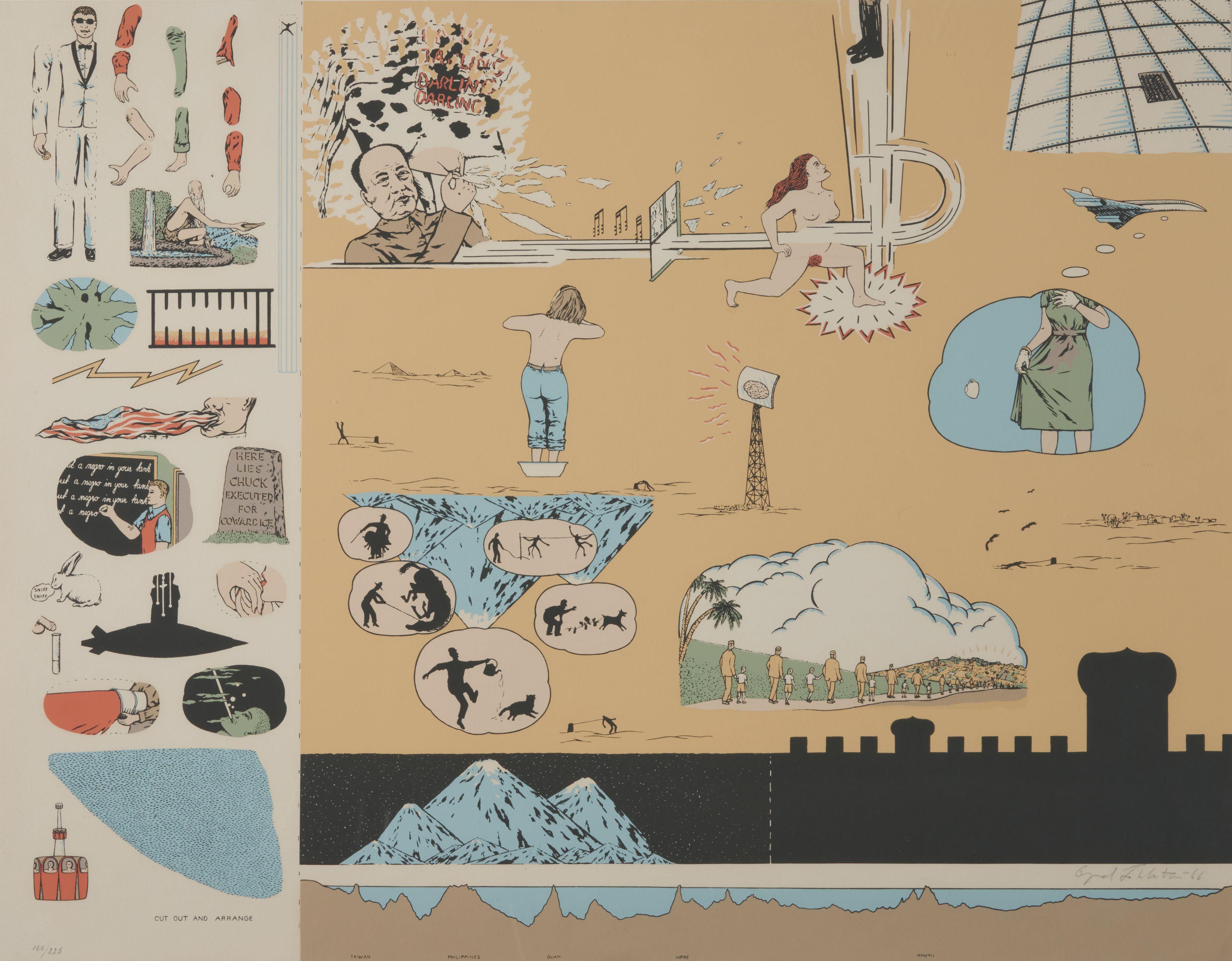 Color screenprint on heavy paper; signed and dated 'Öyvind Fahlström - 66' in pencil within the image l.r, numbered '165/225' in pencil l.l.; published by Tanglewood Press, Inc., New York, framed.
