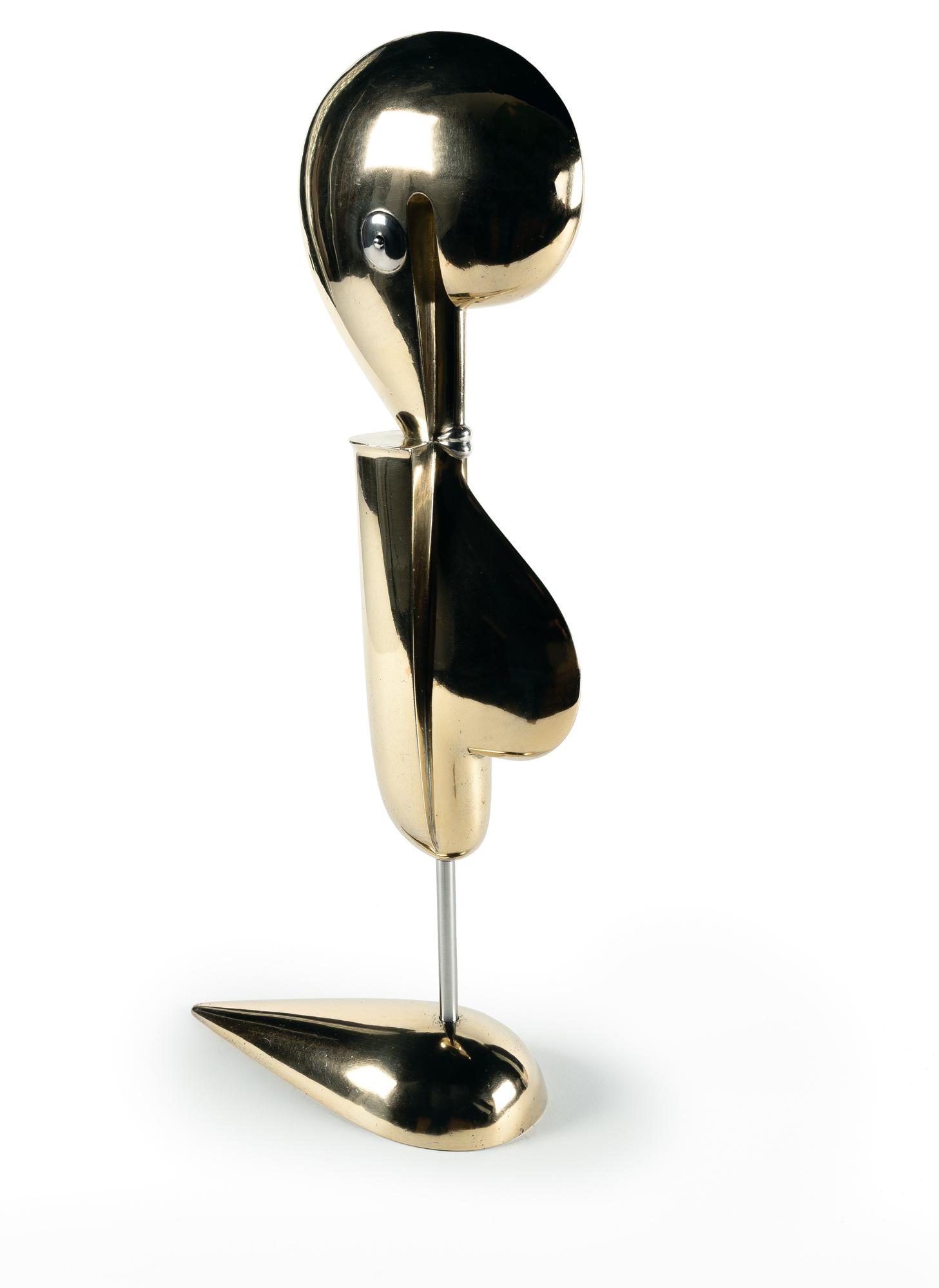 Skulptur. Silberguss, vergoldet. (1923). Ca. 55,5 x 24 x 10,5 cm. Eines von 10 nummerierten Exemplaren der posthumen Edition von 1964 ff. Auf der Unterseite mit gravierter Metallplakette, dort betitelt „Abstrakte Figur“ sowie von Tut Schlemmer signiert (händisch eingeritzt) und nummeriert.