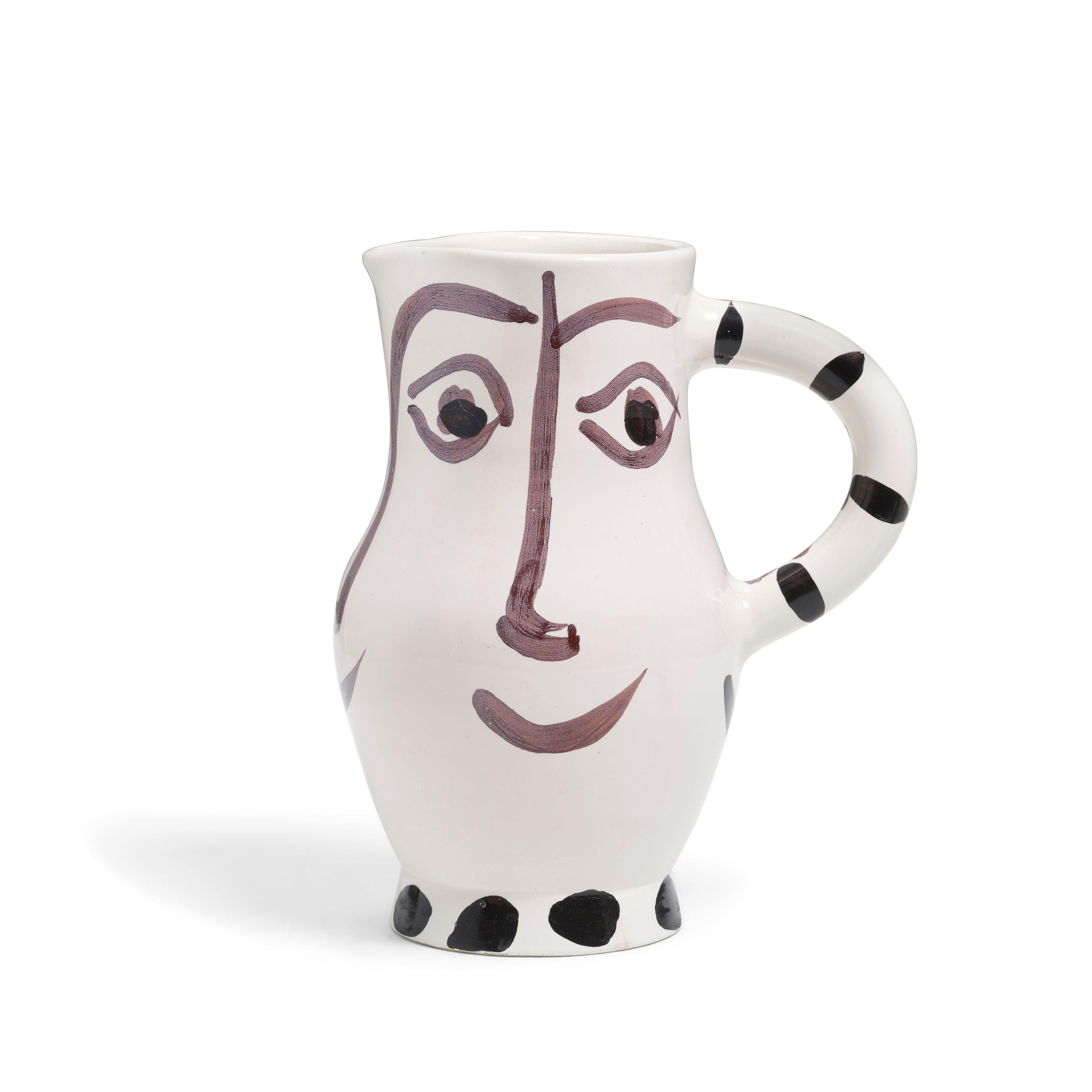Glazed white earthenware clay turned pitcher, colors in engobes, inscribed '183/300', 'Edition Picasso' and 'Madoura', with the 'Edition Picasso' and 'Madoura Plein Feu' pottery stamps on the underside.