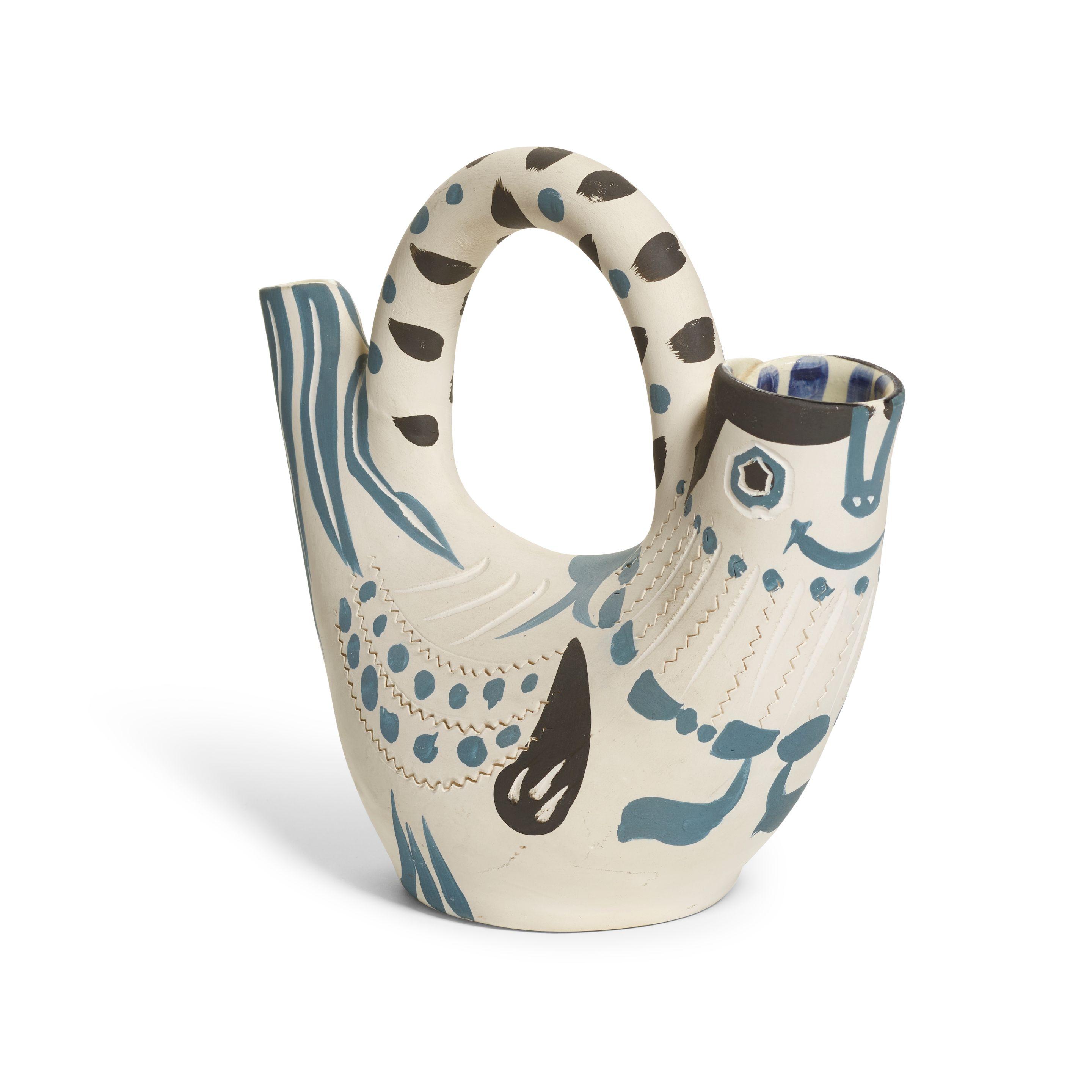 Partially glazed and engraved white earthenware turned pitcher painted in blue and black, incised 215/300, 'Edition Picasso' and 'Madoura', with the 'Edition Picasso' and 'Madoura Plein Feu' pottery stamps on the underside.