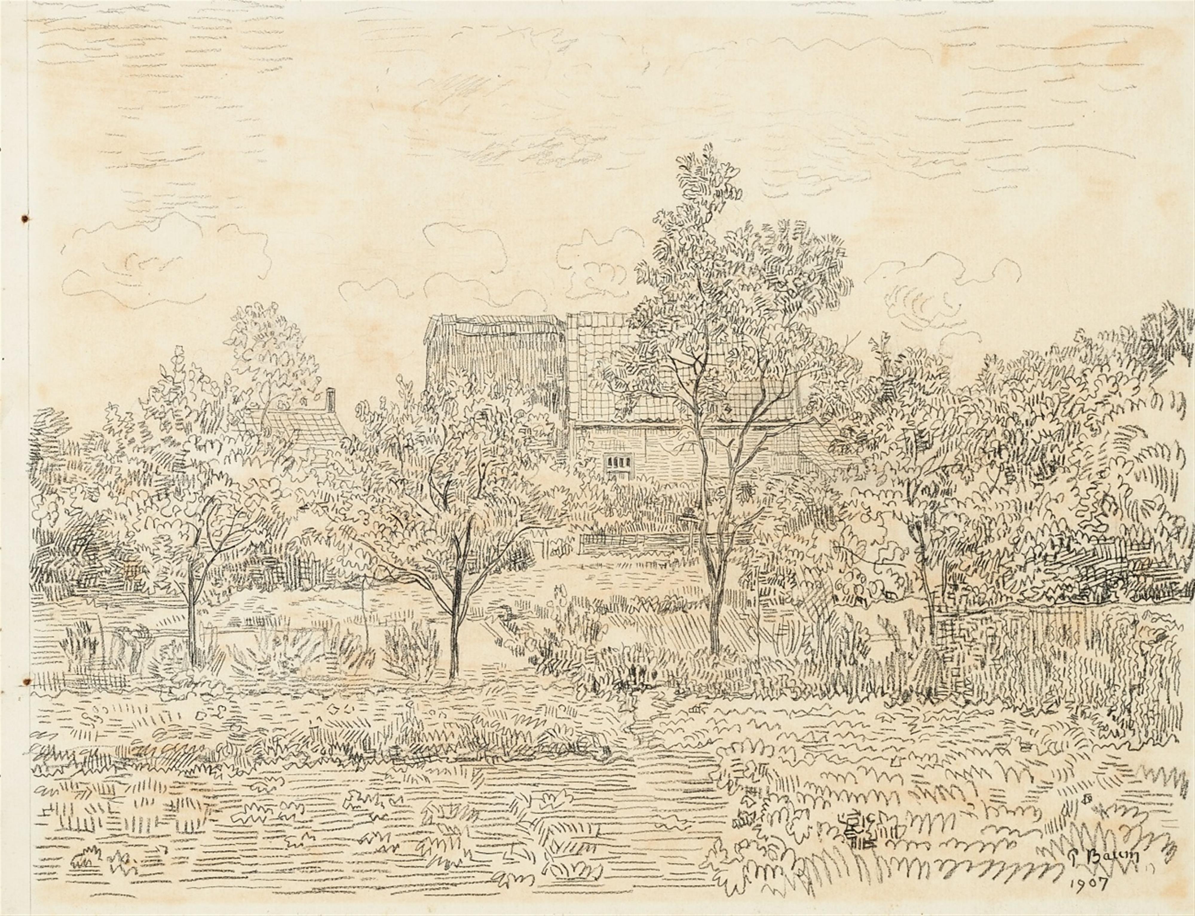 Kreidezeichnung auf Karton 29,6 x 38,3 cm Unten rechts mit schwarzer Tuschfeder signiert und datiert 'P Baum 1907'. Rückseitig bezeichnet "Paul Baum Landschaft aus St. Anna ter Maiden N. 1500" - Insgesamt ungleichmäßig gebräunt.