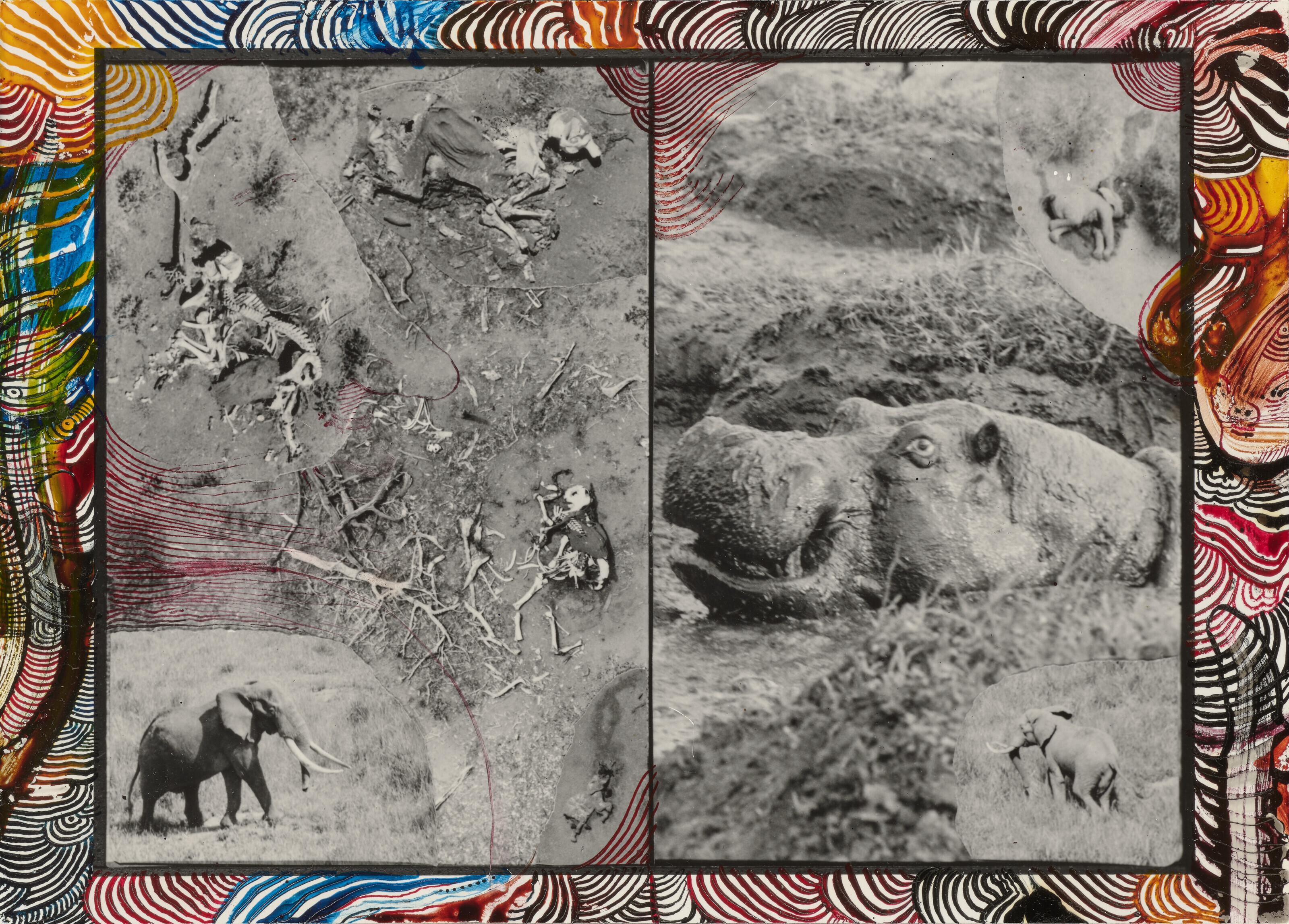 Peter Beard (1938-2020) Overpopulation & The gardeners of Eden, 1984 signé, titré, daté et dessins à l'encre '1984, Starvo & Lake Idi Amin. "Overpopulation & The gardeners of Eden". Peter Beard. Hog Ranch Nairobi' (au dos) tirage argentique avec dessins à l'encre et sang image: 11 x 15 cm. feuille: 12.7 x 17.7 cm. Réalisée en 1984, cette œuvre est unique. signed, titled, dated and drawings in ink '1984, Starvo & Lake Idi Amin. "Overpopulation & The gardeners of Eden". Peter Beard. Hog Ranch Nairobi' (on the reverse) gelatin silver print, with drawings in ink and blood image : 4 3 ⁄ 8 x 5 7 ⁄ 8 in. sheet : 5 x 6 7 ⁄ 8 in. Executed in 1984, this work is unique.
