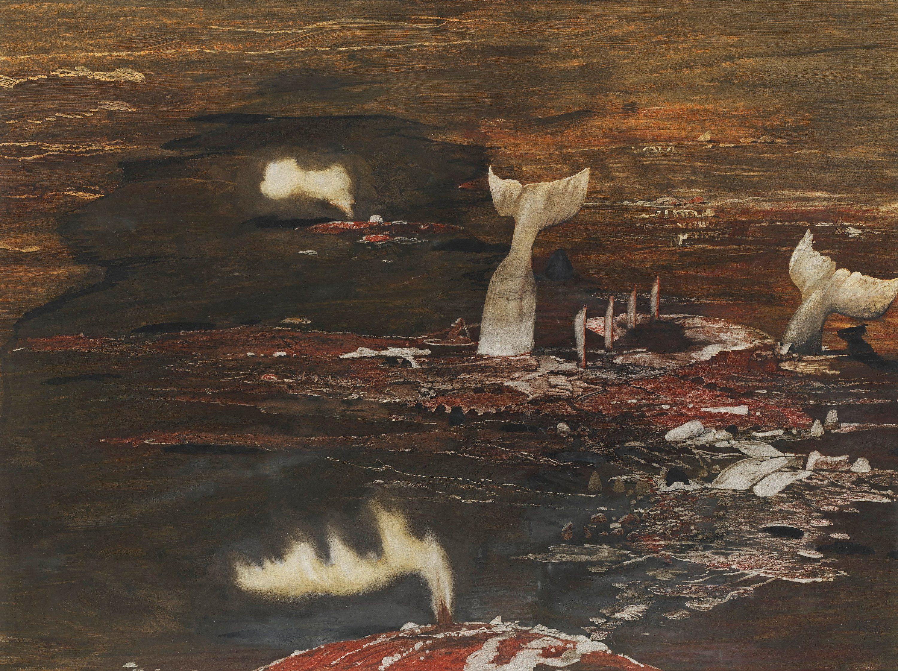 Roj Friberg, "Isländskt landskap" Signed Rf and dated -84. Wax crayon on paper 74 x 99 cm.