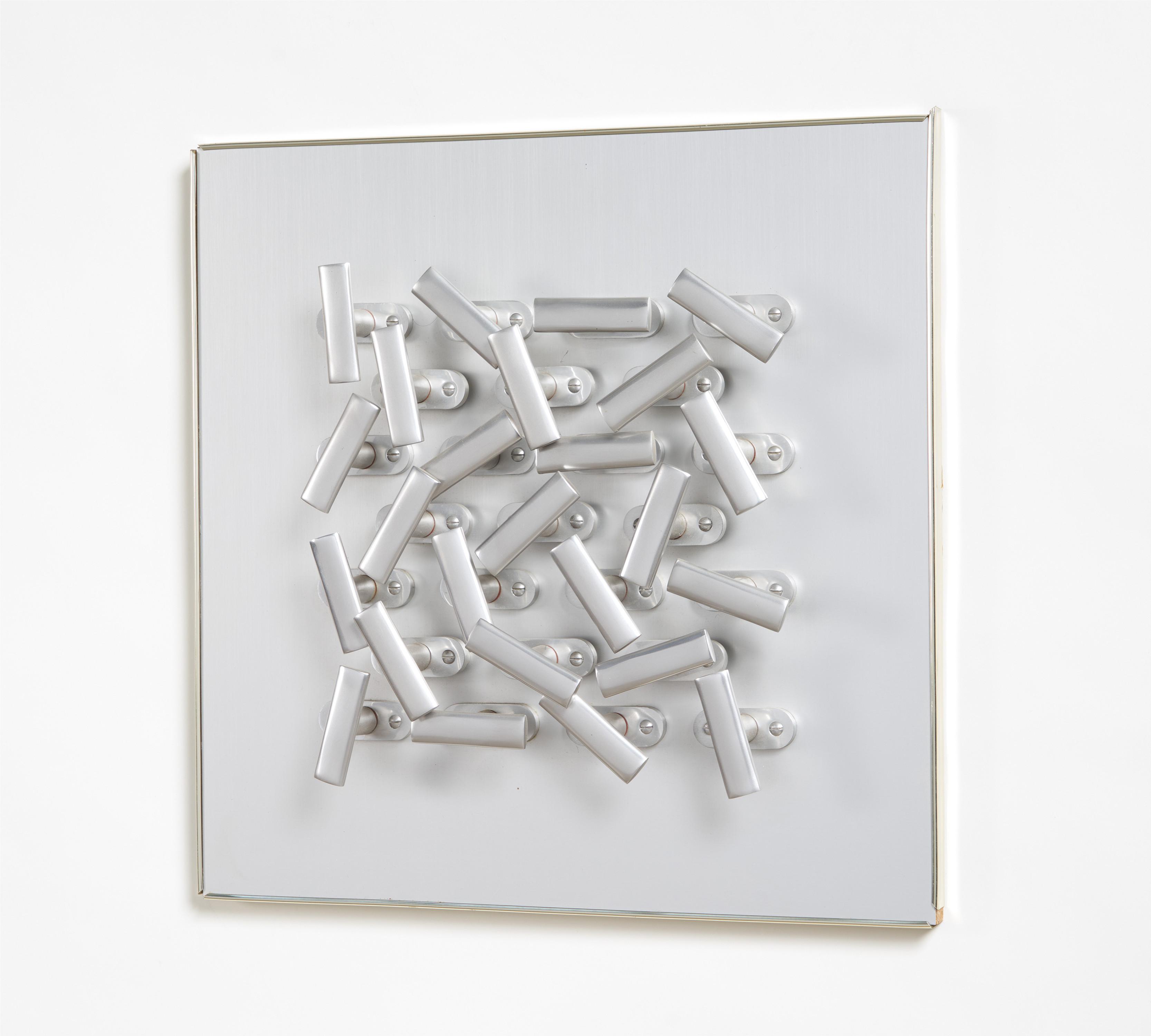 Technik: Ganzoliven (Fenstergriffe) auf Eloxplatte auf Sperrholz.