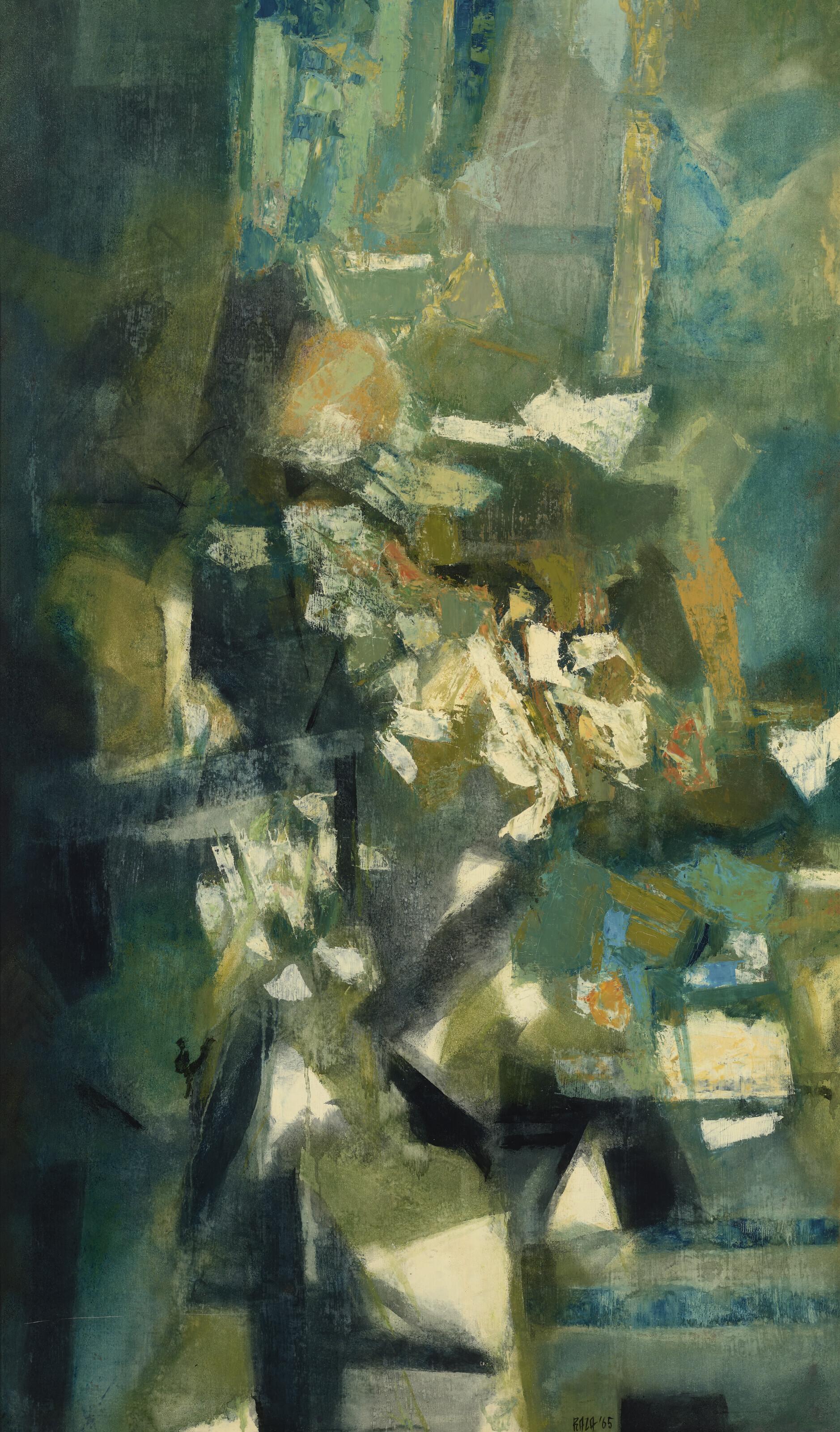 signed and dated 'RAZA '65' (lower center); further signed, inscribed, dated and titled 'RAZA / P_597 '65 / "Petite Lumiére" / 125 X 75' (on the reverse)