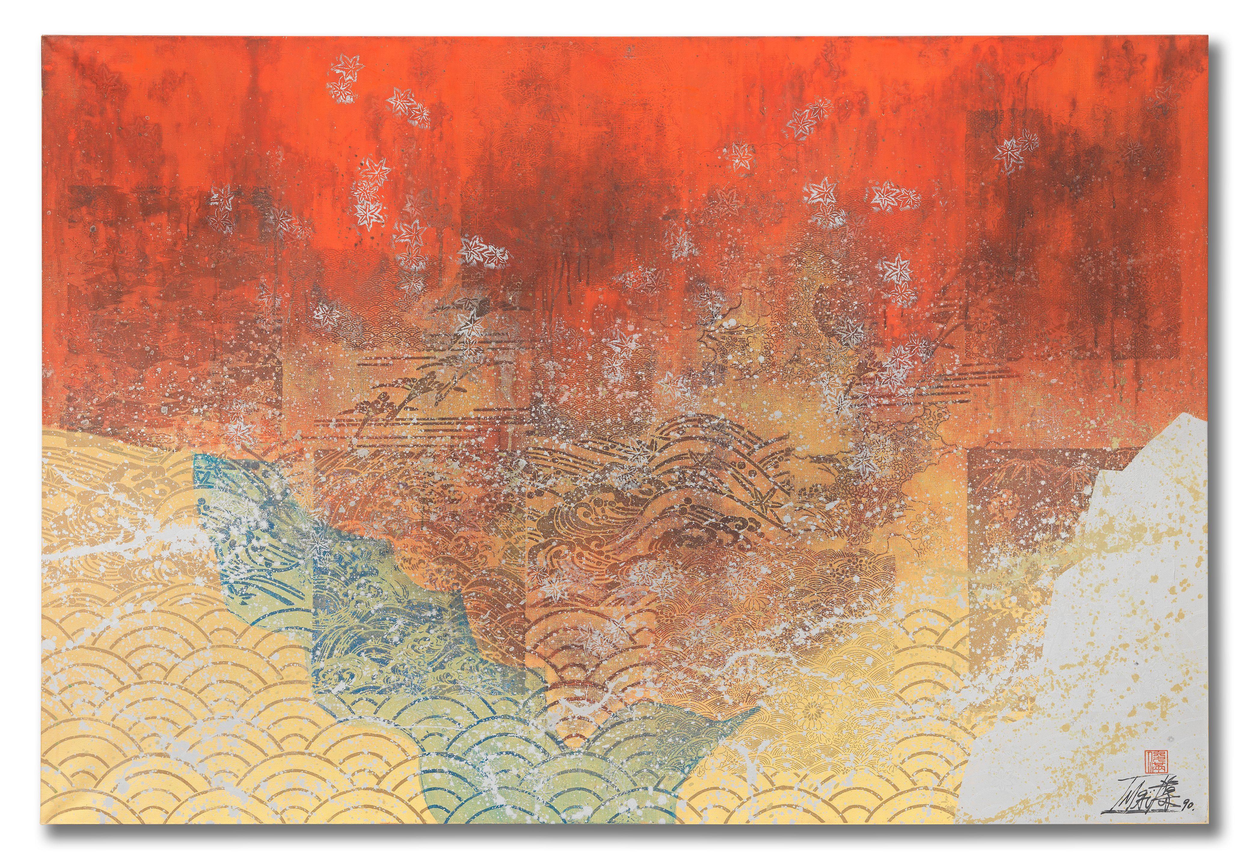 signed, dated and stamped with the artist's seal IMAÏ 俊 満 90 (lower right); signed, dated and inscribed in Japanese IMAÏ 俊満 今井俊満 紅蓮ガラ MAI 1990 一九九〇年五月 (on the reverse)