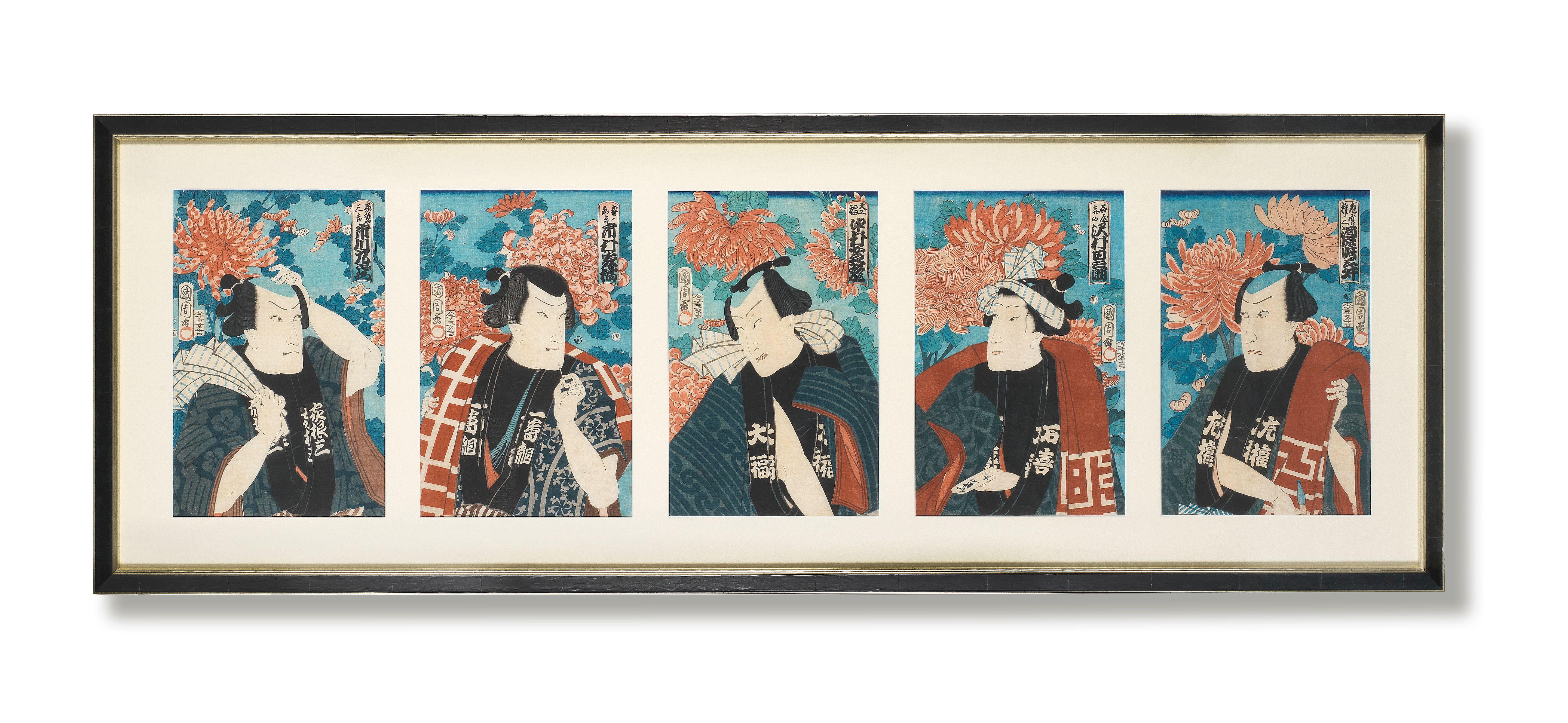 Five oban tate-e prints from a polyptych of the kabuki actors: Kawarazaki Sansho, Sawamura Tanosuke III, Nakamura Shikan IV, Ichimura Kakitsu IV and Ichikawa Kyuzo II, published by Otaya Takichi, with a combined censor and date seal aratame Rat 11 (1864), signed Kunichika ga; framed and glazed as one set. Overall: 52.8cm x 149cm (20 13/16in x 58 5/8in); each sheet: approx., 35.5cm x 23cm (14in x 9 1/16in).