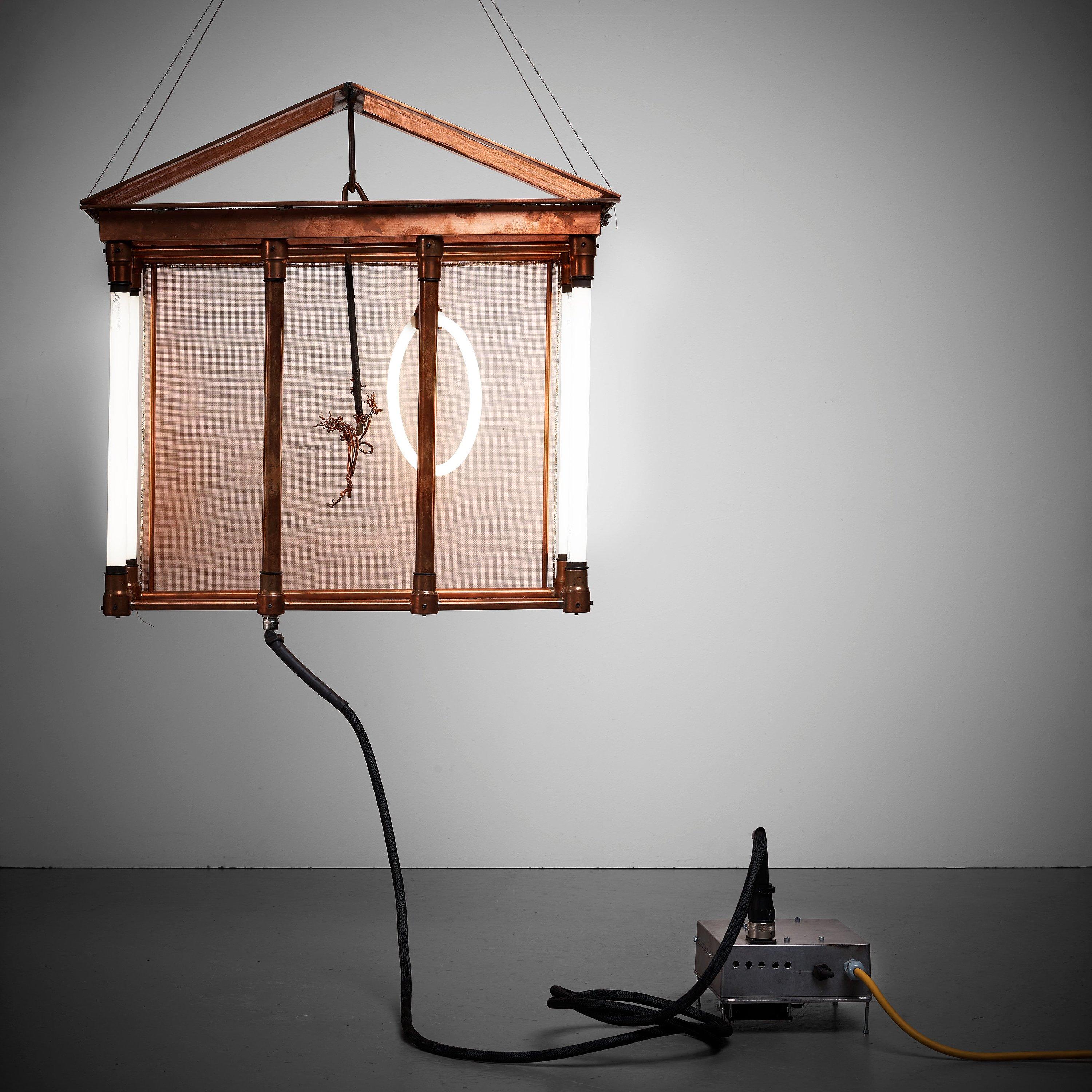 Executed in 2007. Copper, flourescent lightning, rubber, nylon, tin and porcelain height 69, width 56, depth 38 cm.
