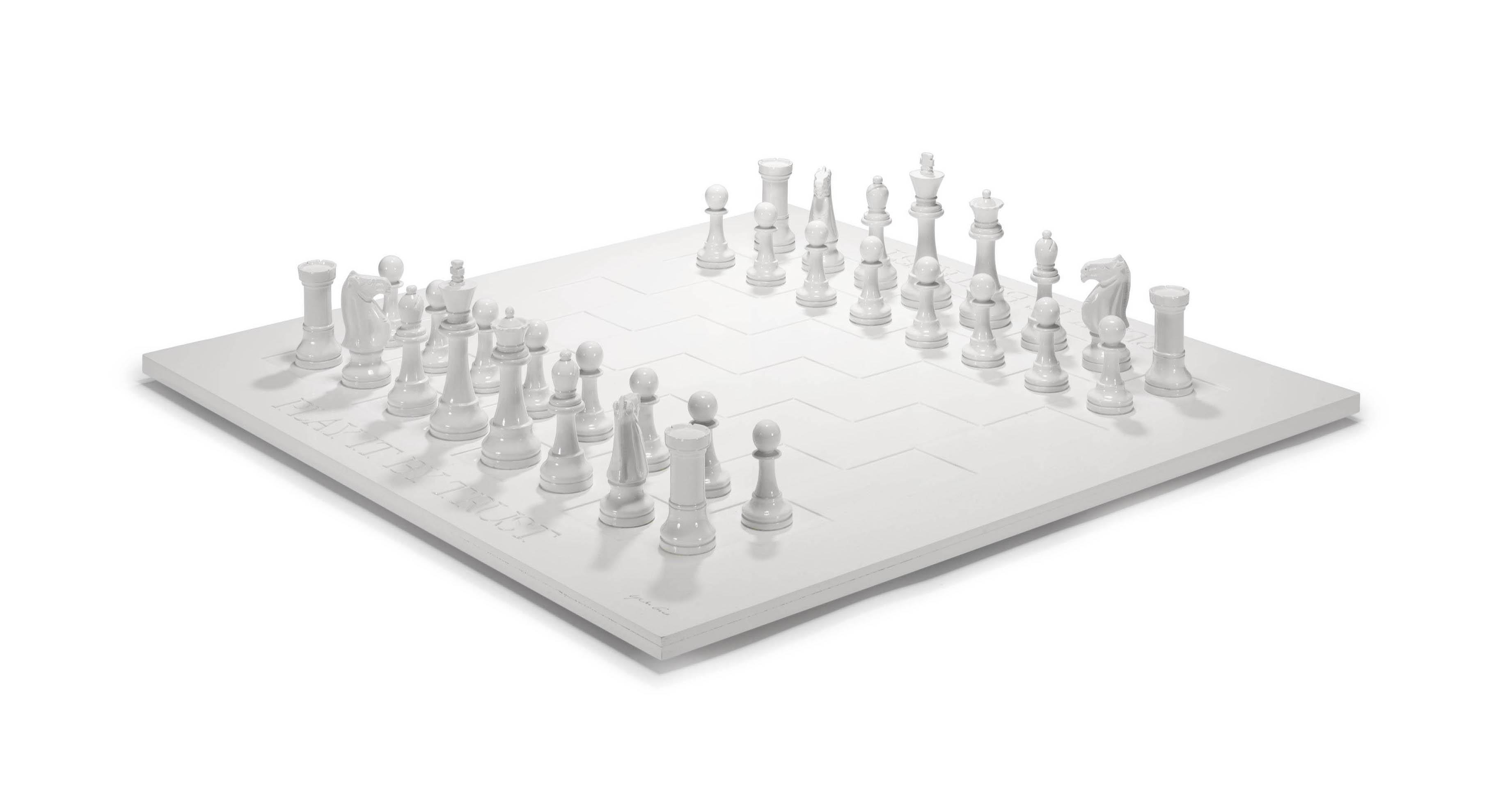 incised with artist's signature and number 'Yoko Ono 2/8' (edge of chessboard) and incised with title twice 'PLAY IT BY TRUST' (on opposite ends of chessboard)