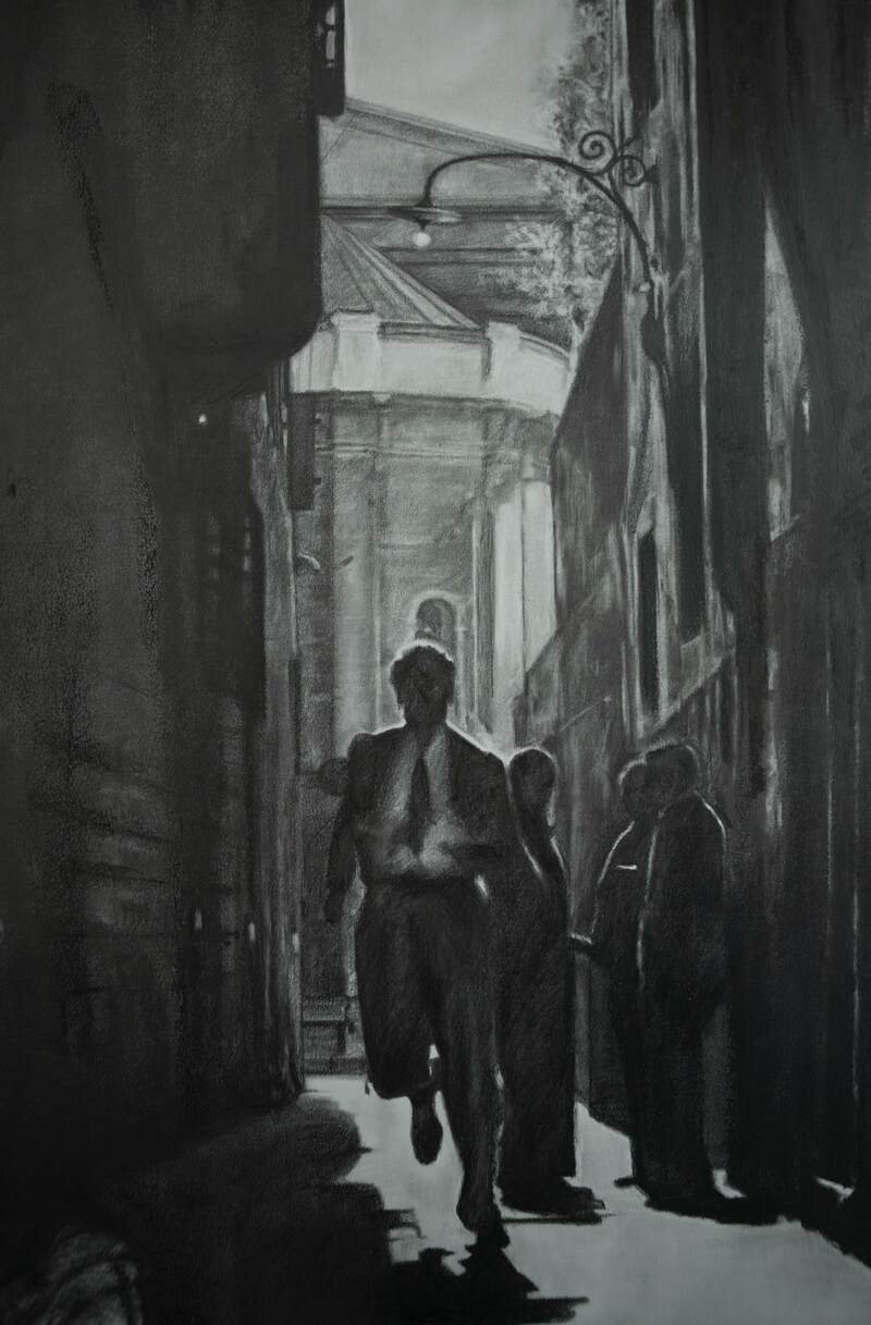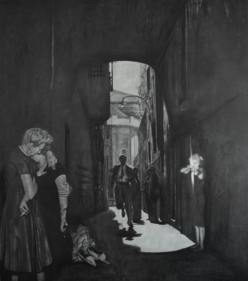 The British artist Nina Mae Fowler is known for her partly large-format pencil and charcoal drawings, mostly made in black and white. Her works frequently show prominent actors and actresses in extraordinary, fateful, often tragic moments. Her outstanding works include complex compositions in which she brings together motifs from a wide variety of temporal and narrative levels in one scene - elaborate works that are developed over a long period of time and are therefore rare and sought-after. Now, with I walk alone, Fowler presented yet another such masterpiece.