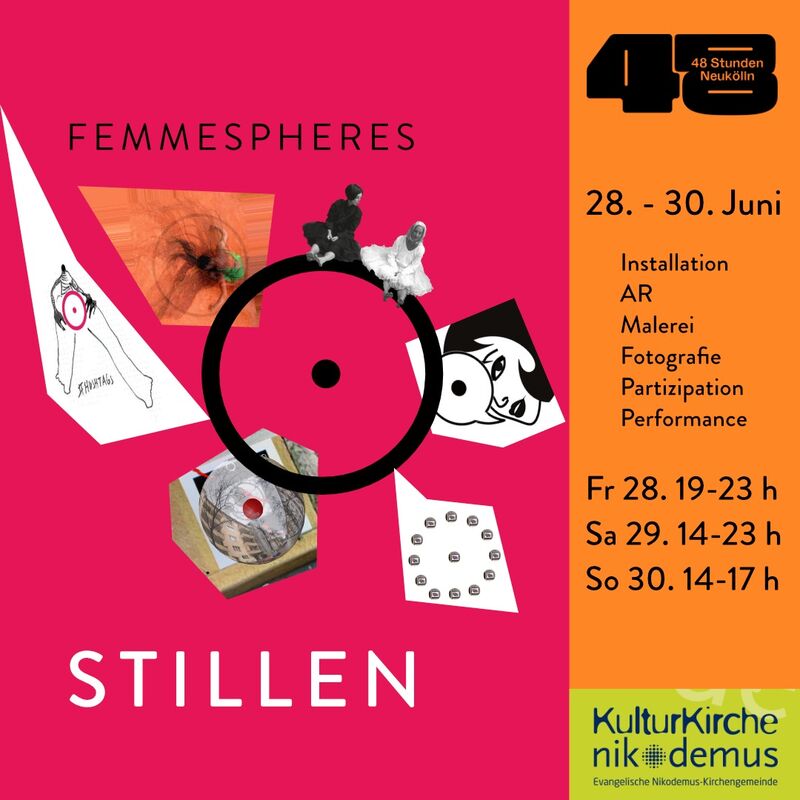 Im Rahmen des Kunstfestivals 48-Stunden-Neukölln präsentiert das Künstlerinnenkollektiv FEMMESPHERES in der Kulturkirche Nikodemus vom 28.-30. Juni 2024 ein Projekt. Unter dem Namen »STILLEN« setzen sich sechs Künstlerinnen mit dem spezifischen Symbol eines Kreises auseinander. Auch Corinna Rosteck, Kunstschaffende aus dem Künstlerprogramm des Art.Salon, ist unter den Teilnehmenden.